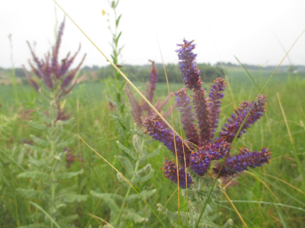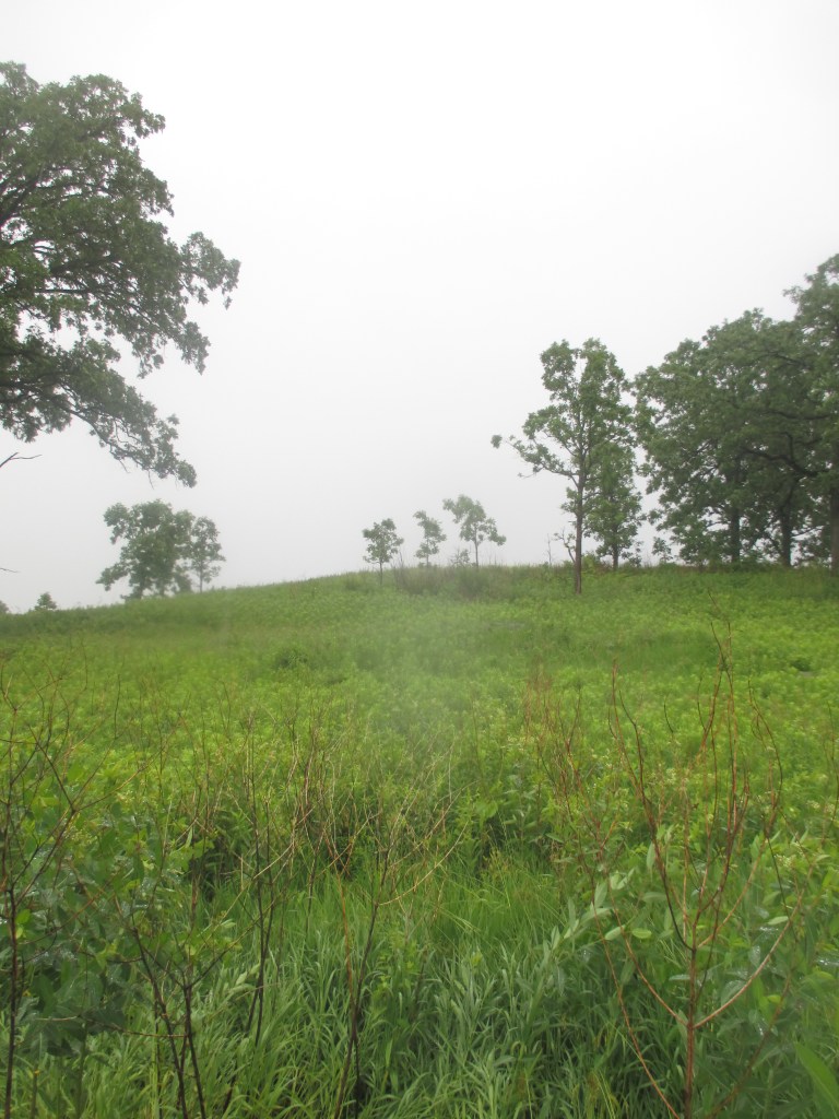 it was a very wet and very satisfying walk. we turned back once due to lightning, but then the rain let up and we changed course once again. after a walk along the bottom of the drumlin and into the oak opening (rain sounding great on the leaves), i trekked up to the ridge and had a look about the lowlands surrounding. a graceful time. also, first conscious encounters with leadplant, thimbleweed, and flowering spurge. the soundscape is flush with raindrops.