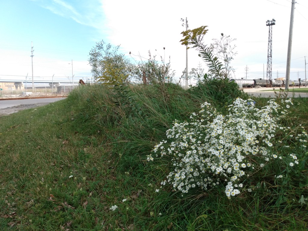 the park is built on the site of one of the last residents’ home and tavern, capt. felix struck’s harbor inn. amid all the industrial blight, a few trees (the larger a willow, i think), grass, and a few ornamentals survive here. a small berm just across from the park has longer grass and a small but sturdy representation of the area’s most common city wildflowers. hanging on.